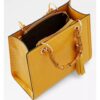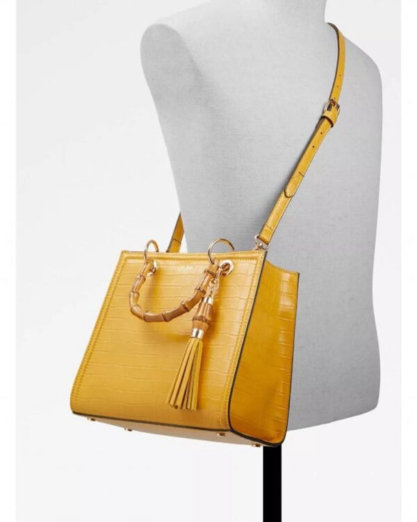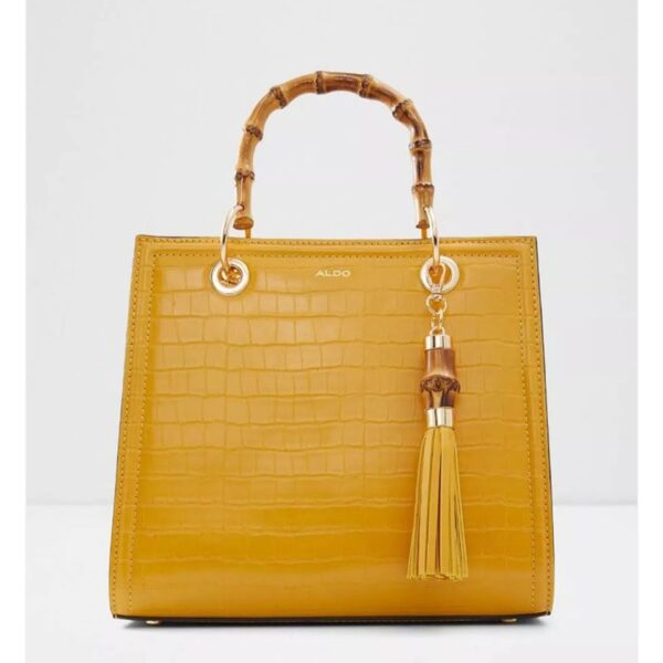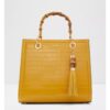 An intricate bamboo handle ornates this structured top handle bag embellished with a striking chain detail.