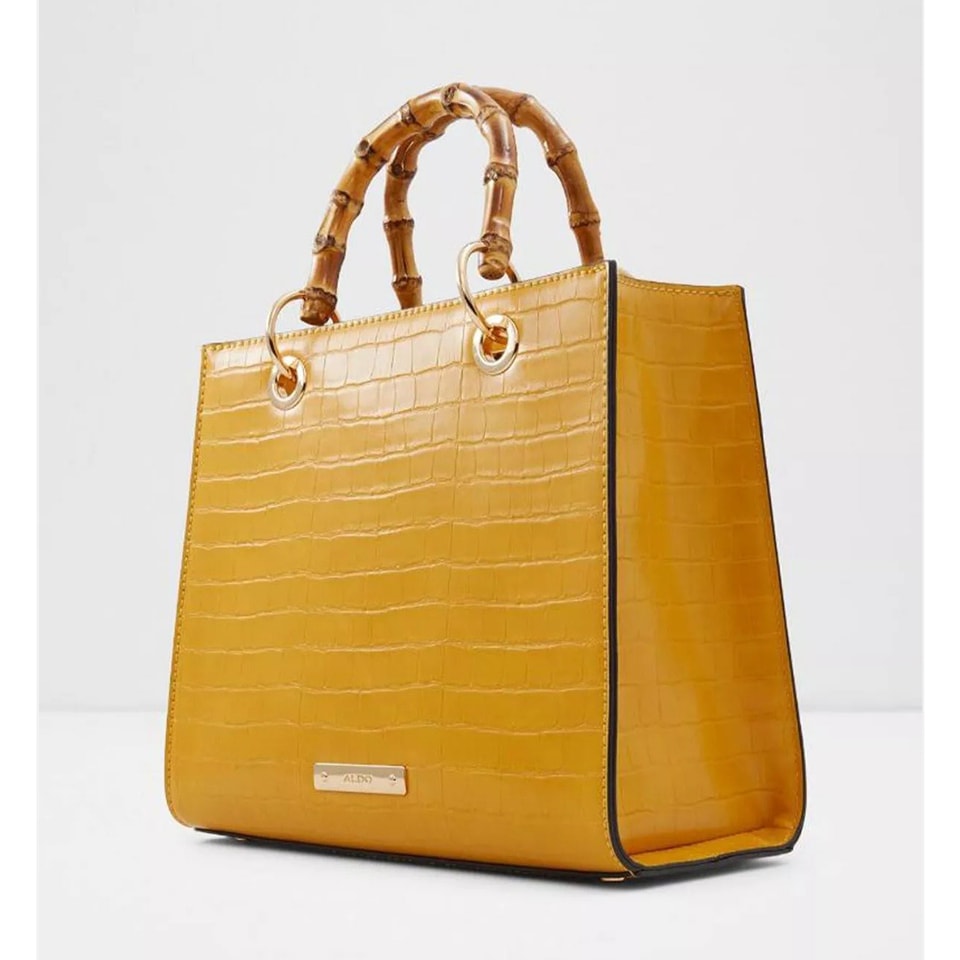 An intricate bamboo handle ornates this structured top handle bag embellished with a striking chain detail.