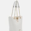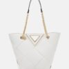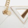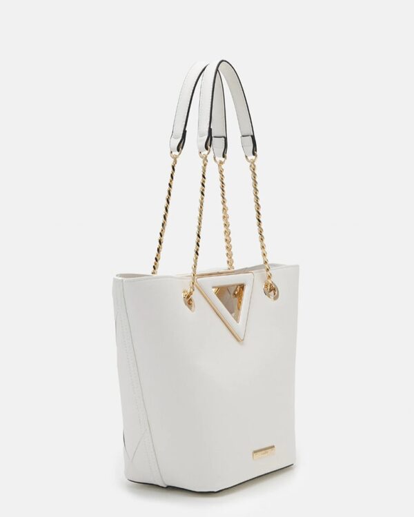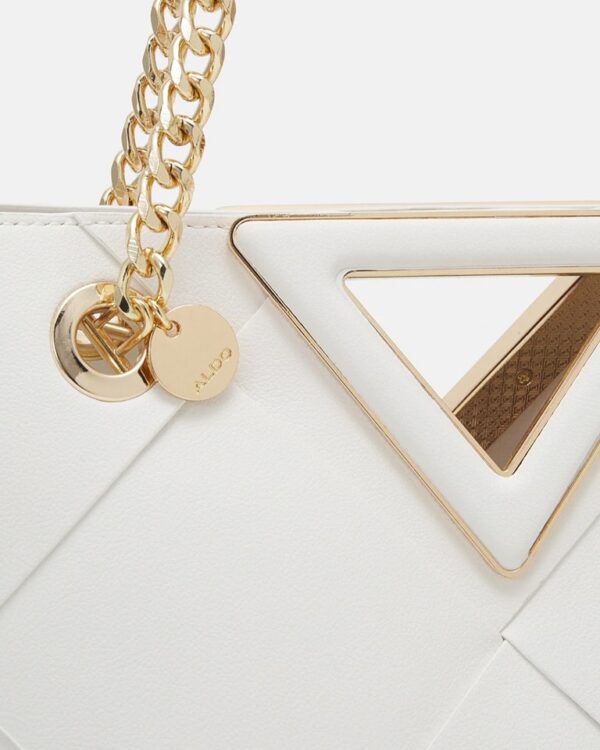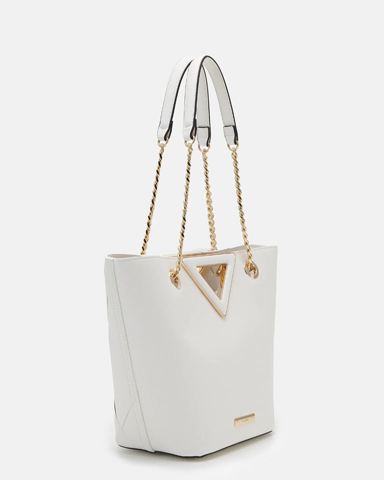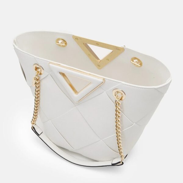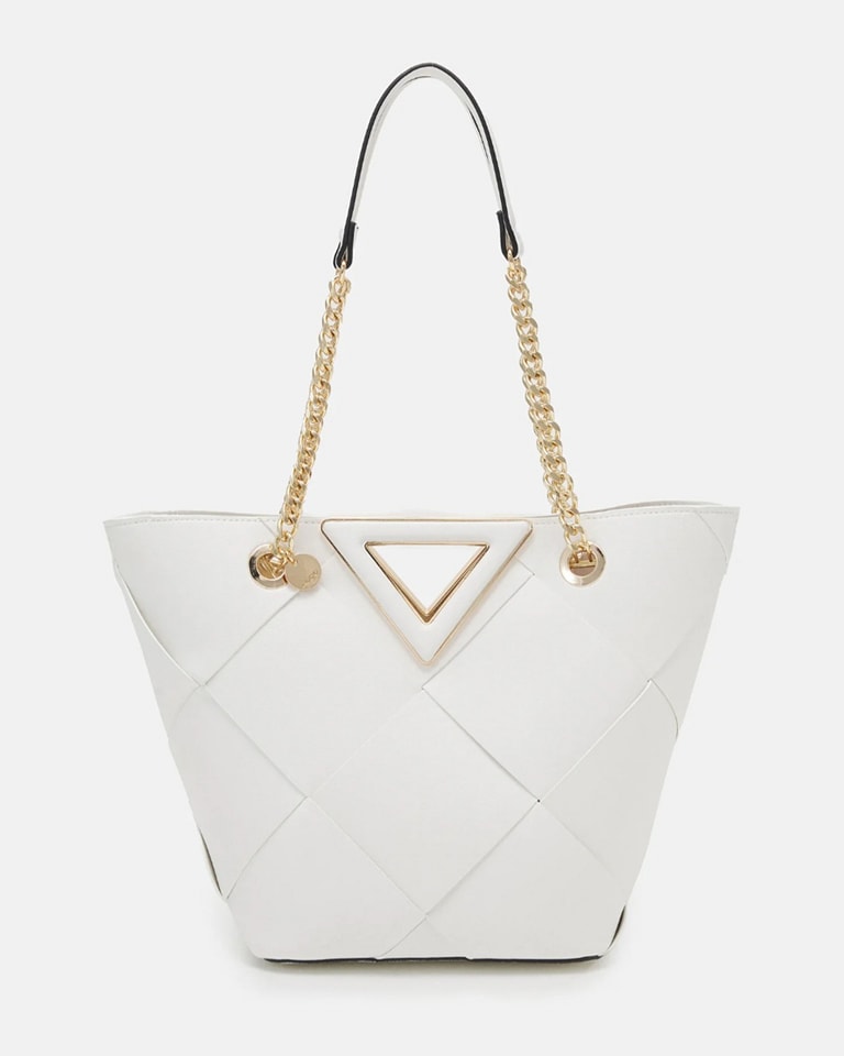 Add a little drama to your summertime look with this elegant V-shape tote bag. The fresh white woven surface includes gold-tone hardware and a chain handle for over-the-shoulder wear plus an integrated handle for hand-held use. Store all those everyday must-have items in the roomy, single-compartment storage.