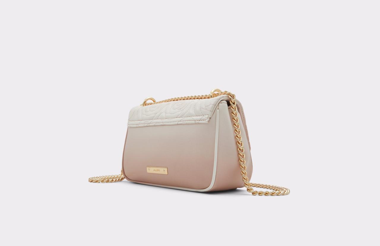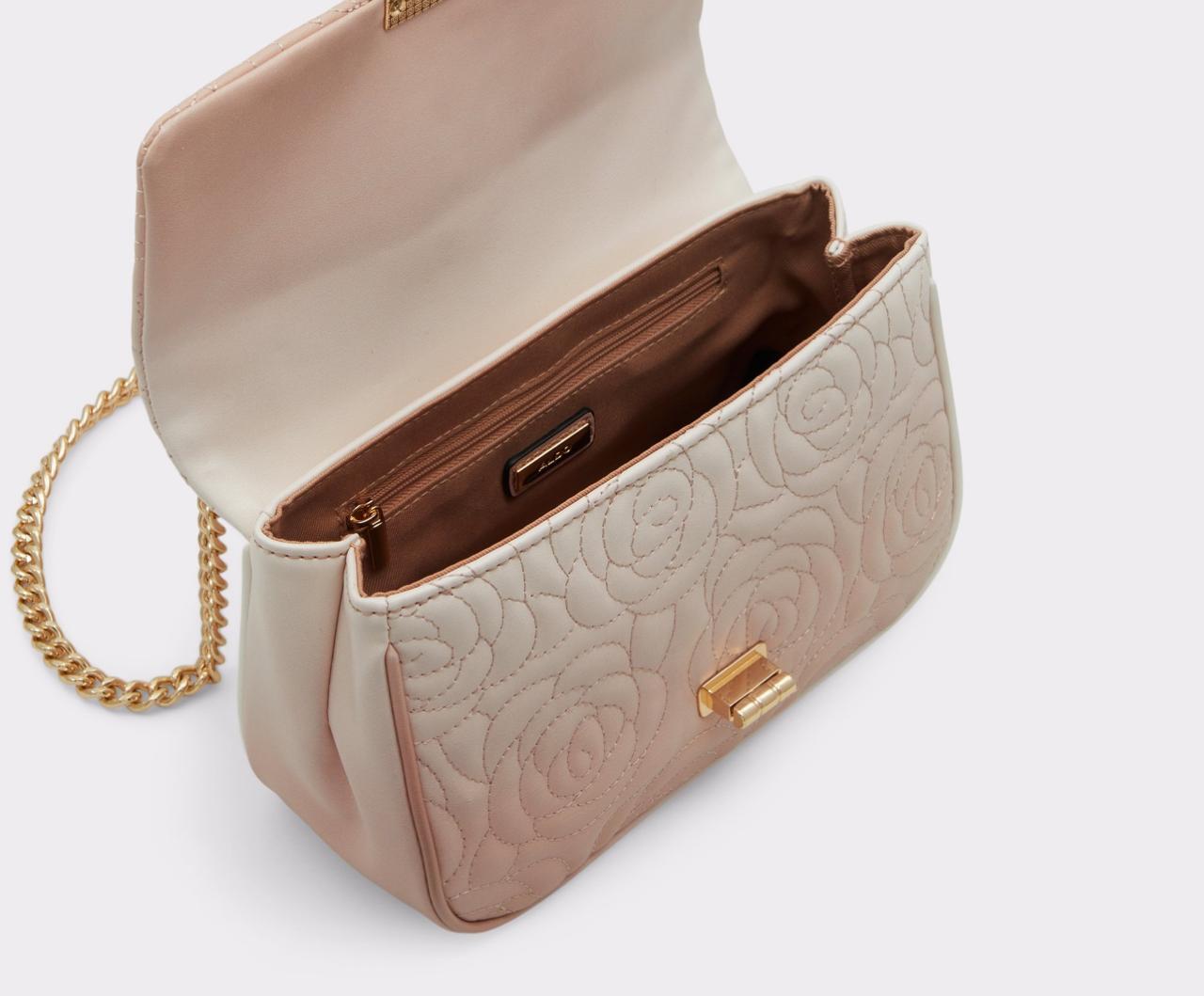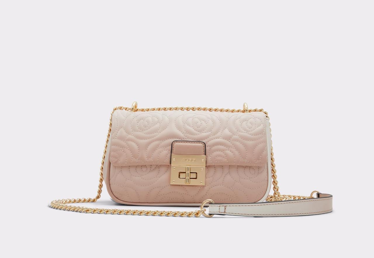 A subtle floral design and chain crossbody strap adds feminine charm to this style-defining handbag.