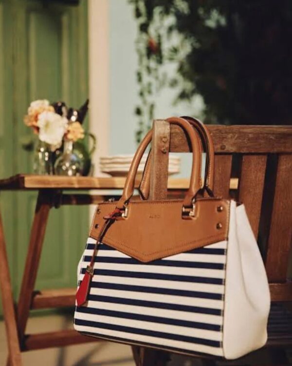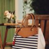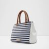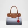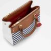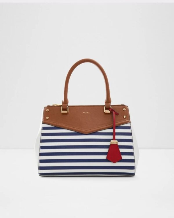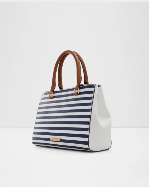 Bring a nautical vibe to any wardrobe with this navy/white tote bag with a leather-look upper. Three-compartment storage holds all the essentials with top zippered closure keeping items safely out of sight. Light gold-tone hardware plus dual handles add a quality feel while an adjustable/removable strap converts to a shoulder bag.