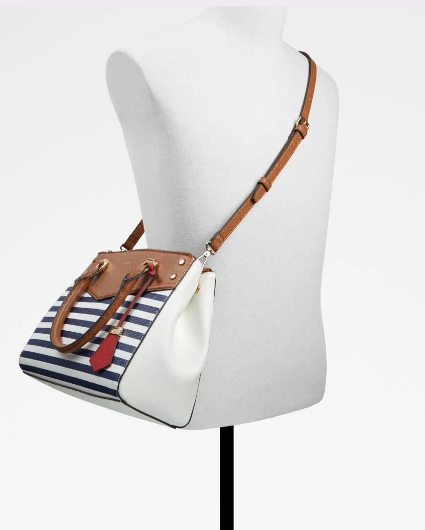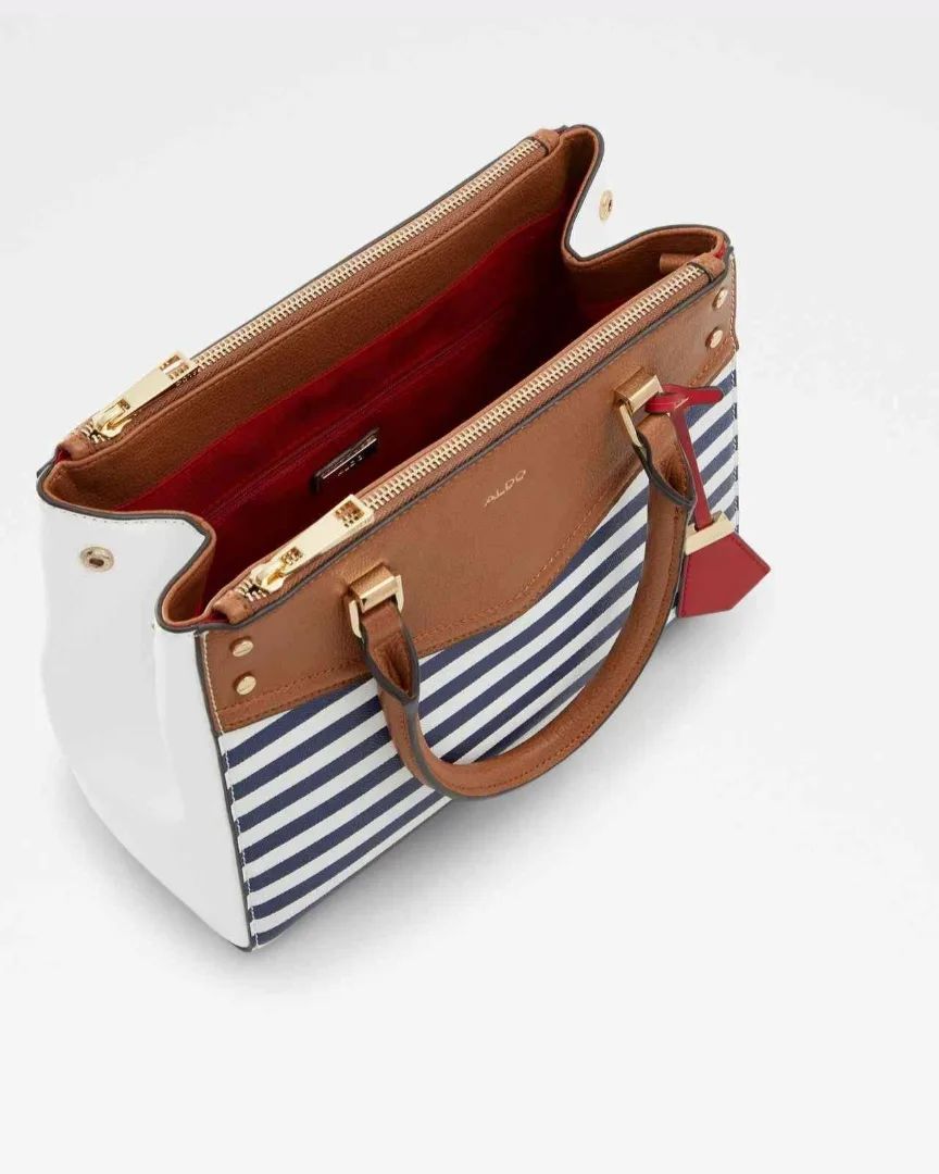 Bring a nautical vibe to any wardrobe with this navy/white tote bag with a leather-look upper. Three-compartment storage holds all the essentials with top zippered closure keeping items safely out of sight. Light gold-tone hardware plus dual handles add a quality feel while an adjustable/removable strap converts to a shoulder bag.
