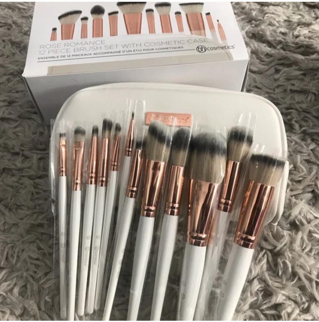 elegant white and rose-gold handles, Rose Romance 12 Piece Brush Set contains everything you need for seamless application and blending of your favourite powders, creams and liquids