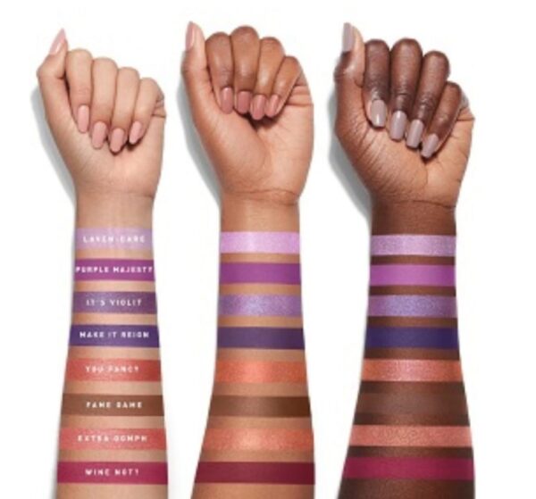 ROW 4: Laven-dare / sheer icy lavender shimmer, Purple Majesty / matte blooming orchid, It’s Violit / sheer summer violet shimmer, Make It Reign / matte royal indigo, You Fancy / shimmering autumn blaze, Fame Game / matte black walnut, Extra Oomph / shimmering ember, Wine Not? / matte mulberry wine
