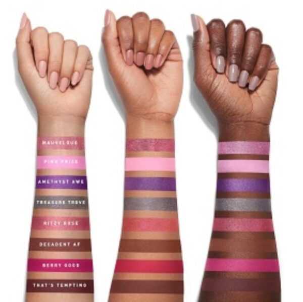 ROW 2: Mauvelous / shimmering cherry macaron, Pink Prize / matte bubblegum, Amethyst Awe / vibrant amethyst satin, Treasure Trove / shimmering wrought iron, Ritzy Rose / shimmering strawberry frose, Decadent AF / matte chocolate caramel, Berry Good / matte hot pink carnation, That’s Tempting / matte mahogany rust