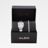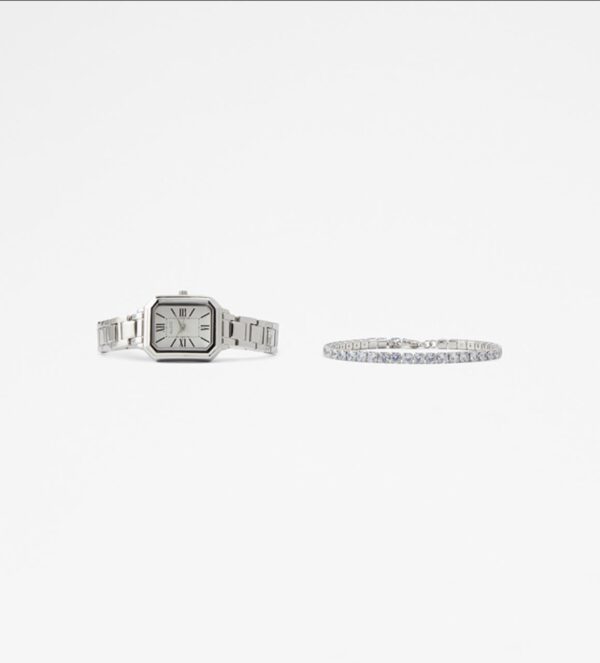 Aldo Add an elegant component to any outfit with this designer-influenced women’s wristwatch and bracelet set. Silver-tone watch strap features a square-shaped dial face with roman numeral hour markers. A crystal-studded tennis-style bracelet completes this upmarket look.
