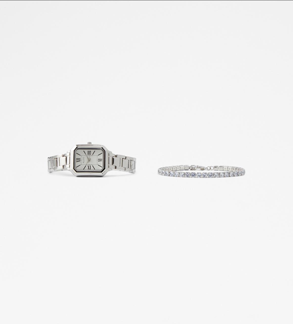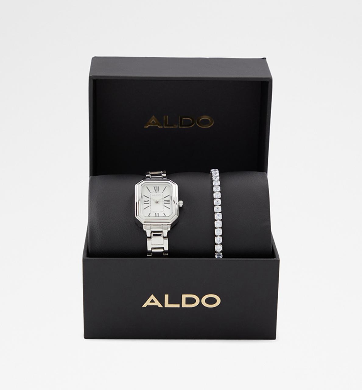 Aldo Add an elegant component to any outfit with this designer-influenced women’s wristwatch and bracelet set. Silver-tone watch strap features a square-shaped dial face with roman numeral hour markers. A crystal-studded tennis-style bracelet completes this upmarket look.